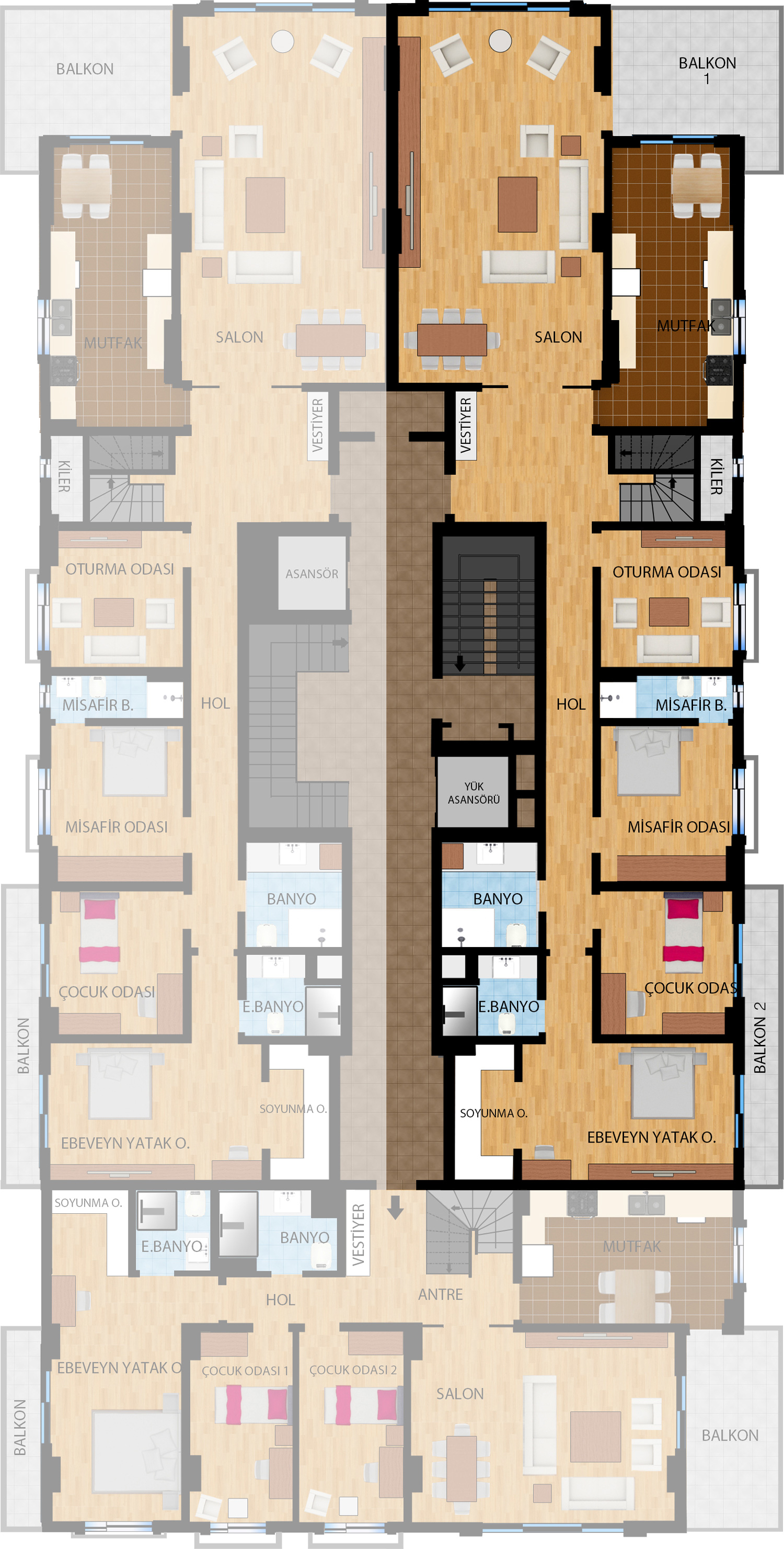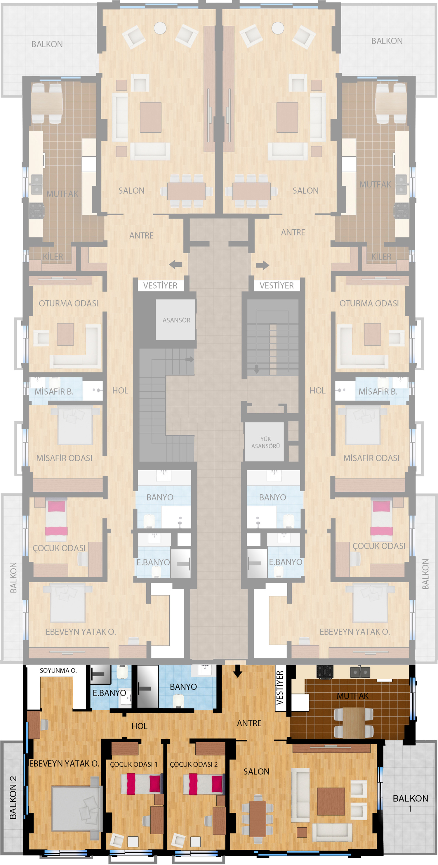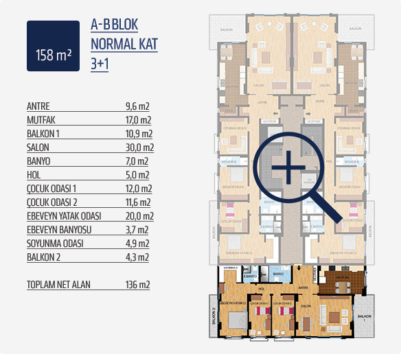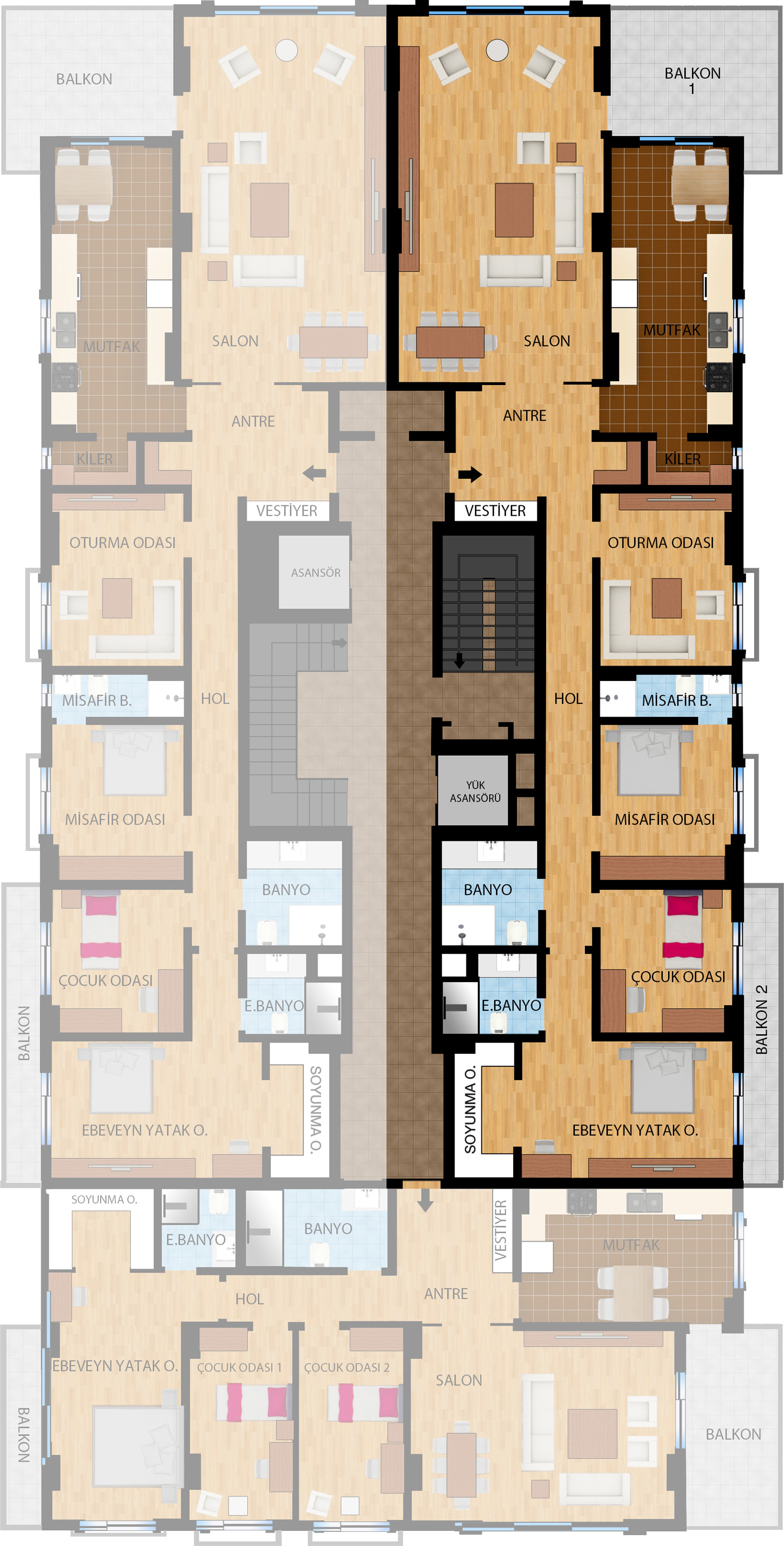 7,5 ve 3 katlı, 6 blok şeklinde tasarlanan projemizde 3+1, 4+1, 5+1 ve dubleks 4+2 ve 5+2 olmak üzere farklı tiplerde toplam 78 daire yer alıyor.