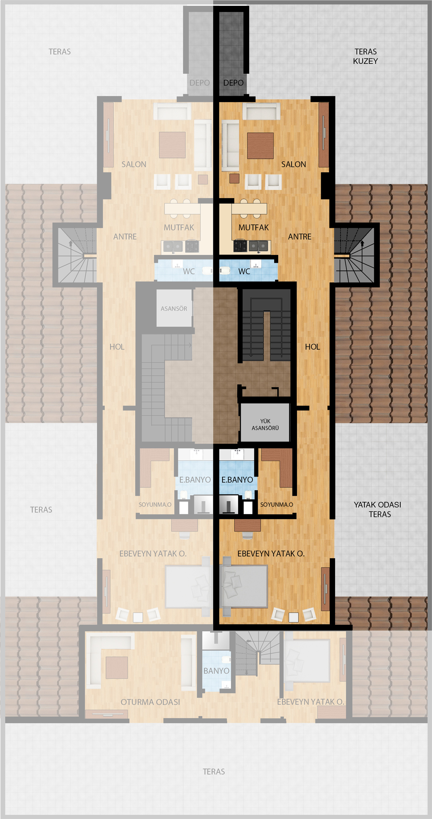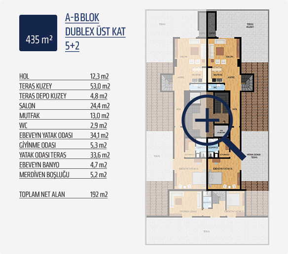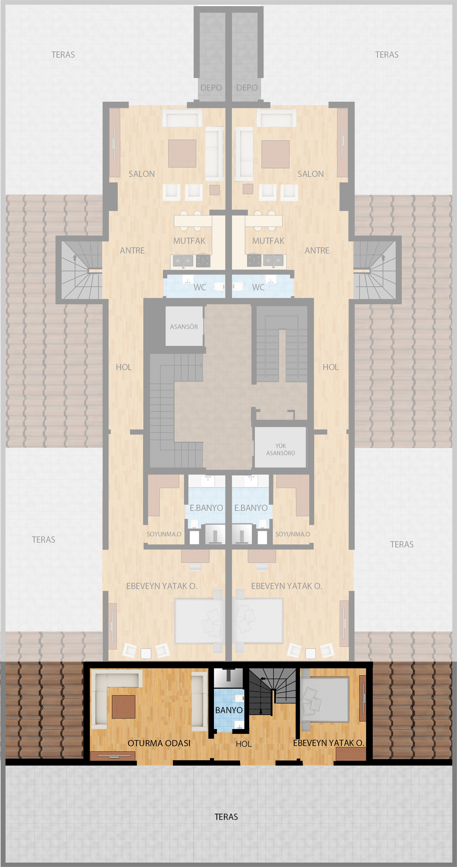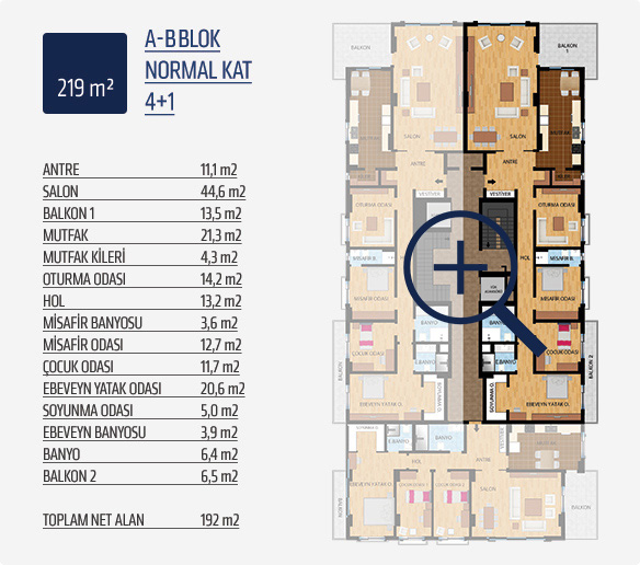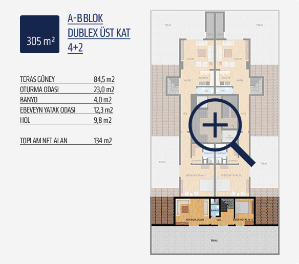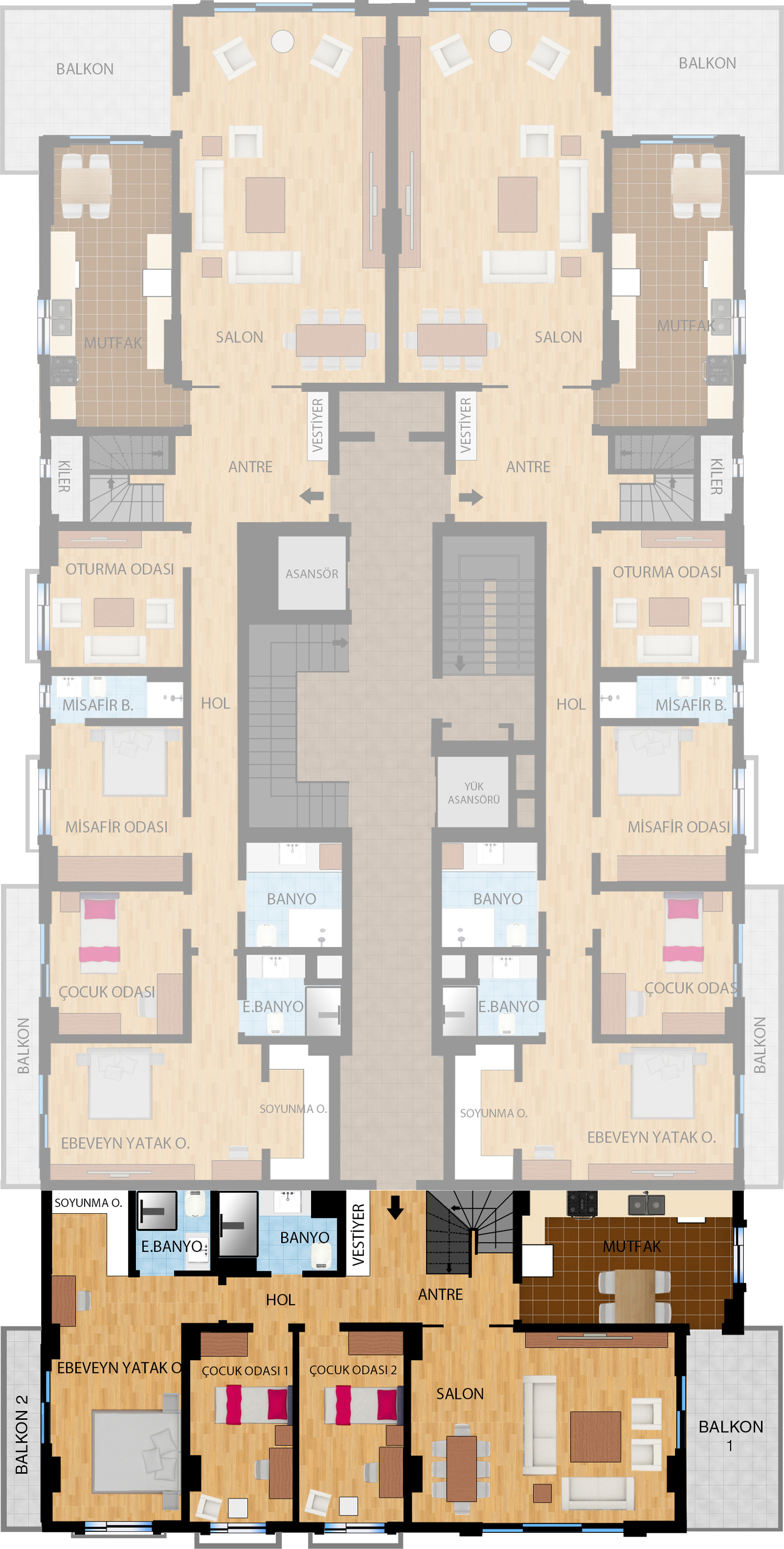7,5 ve 3 katlı, 6 blok şeklinde tasarlanan projemizde 3+1, 4+1, 5+1 ve dubleks 4+2 ve 5+2 olmak üzere farklı tiplerde toplam 78 daire yer alıyor.